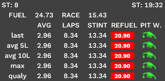 The fuel calculator provides you with information about your remaining fuel and predicts the expected laps of the race. It calculates your average fuel consumption per lap and offers various calculation options to display. This tool helps you gauge your refueling needs during the race, allowing you to make informed decisions about whether you need to save fuel or not.
