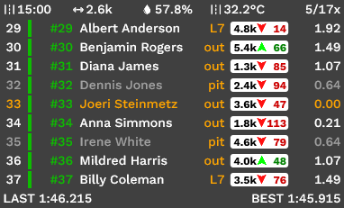 iOverlay offers a customizable standings overlay feature, providing real-time information during your race, qualify and practice sessions. You can configure the information you'd like to see for each session and arrange it as you want. Some of the available columns are: positions gained, license status, iRating (and gain), car brand, interval, gap, last lap time, delta with other drivers, and pit stop status. There are even more options to choose from. Additionally, you have the posibility to customize header values to your liking and select from approximately 32 telemetry values.